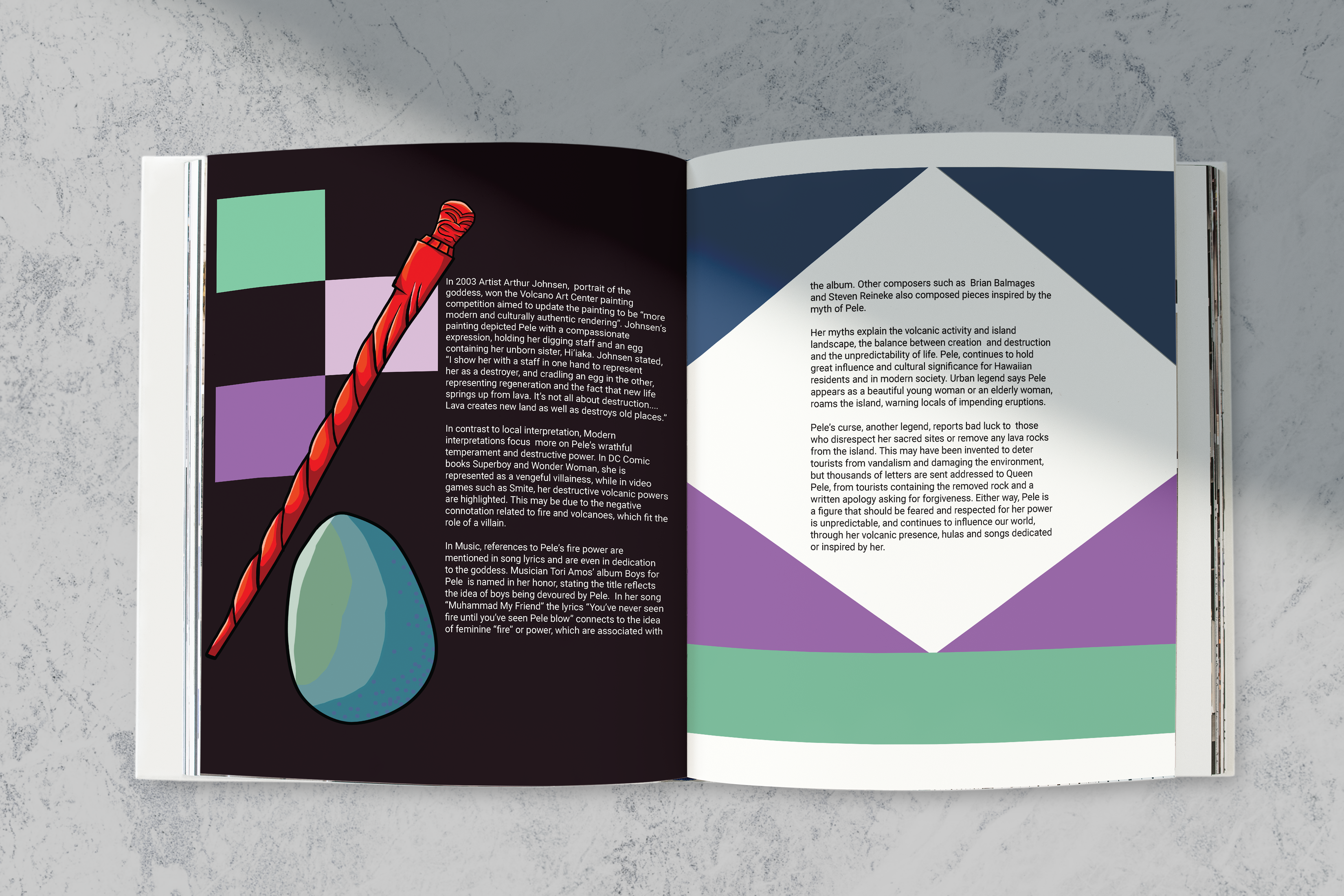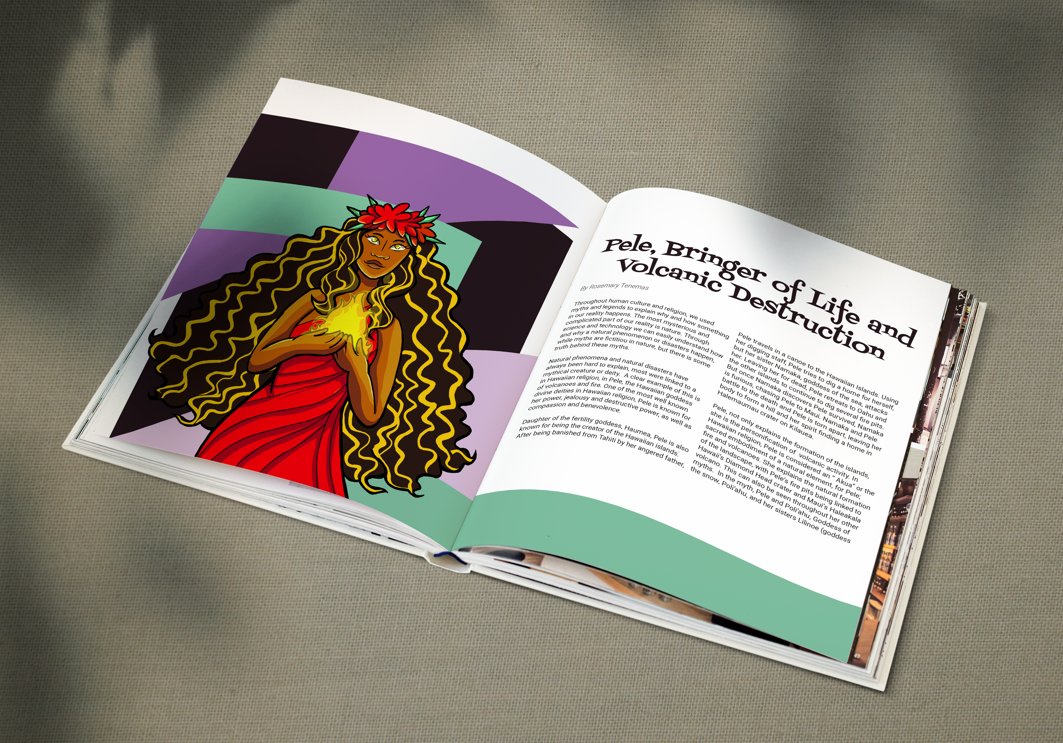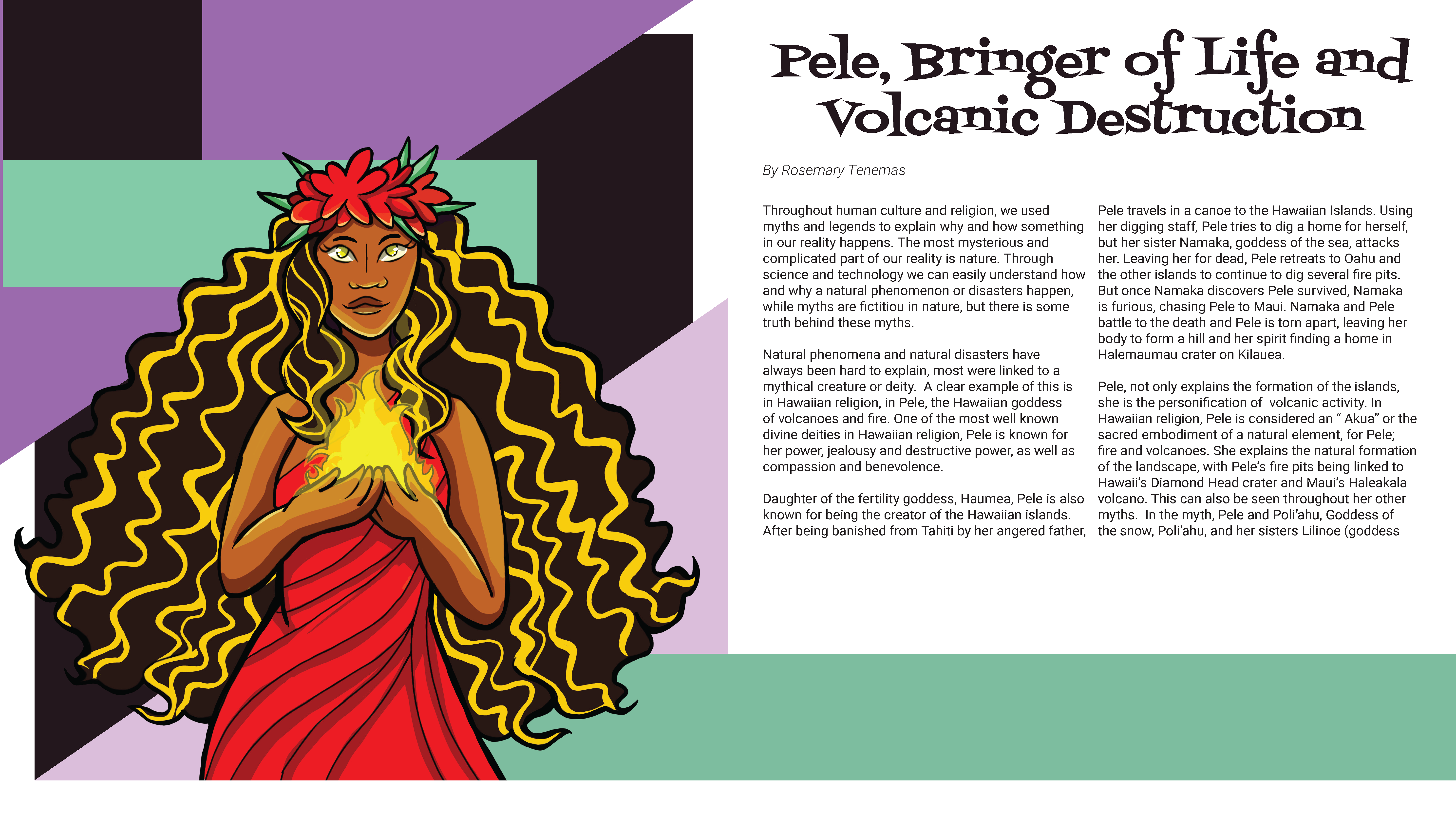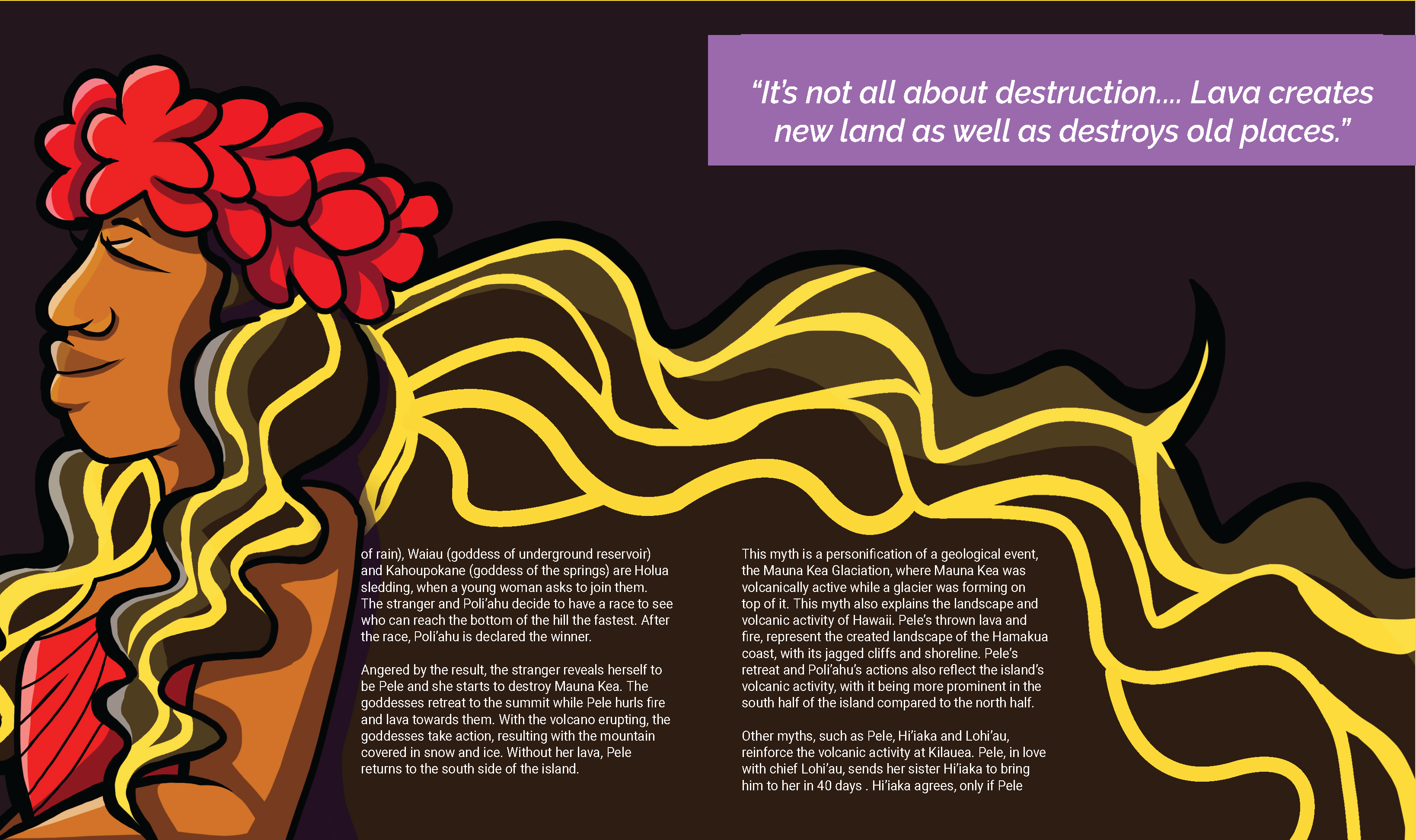 Each member was given a topic to focus on and research mythology that reflects their topic. For my spreads, I focused on the Hawaiian goddess of volcanoes and fire, Pele, and her connection with the environment. I aimed to create an illustration that were visually dynamic yet balanced alongside the text.